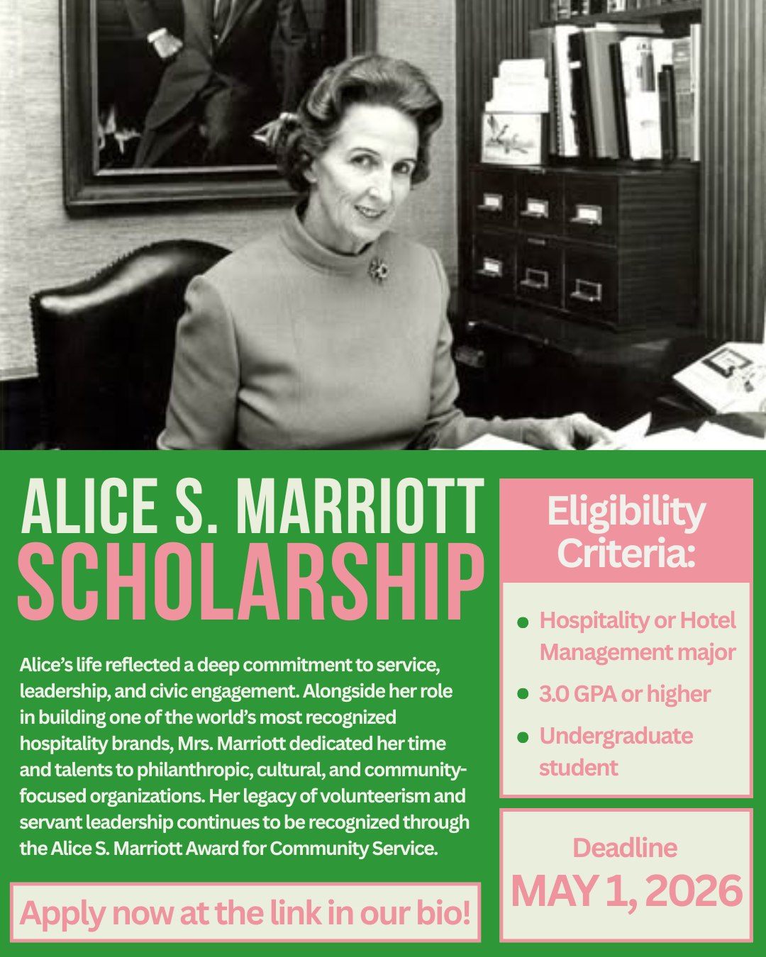 This month we are featuring the Alice S. Marriott Scholarship! Alice was a pioneer in the hospitality industry whose legacy continues to support future leaders. If you meet the criteria, apply now via our Scholarships tab.